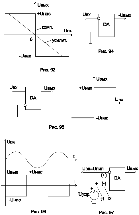 Компараторы определяют знак входного сигнала. Компараторы являются связующим элементом между аналоговыми и цифровыми схемами. Для реализации компаратора может использоваться операционный усилитель без обвязывающих цепей Zвх, Zос. Характеристика компаратора должна иметь вид, показанный на рис.93. Чтобы из инвертирующего включения получить компаратор, из схемы необходимо убрать Rос. R1 можно закоротить, как показано на рис. 94. Возможно и неинвертирующее включение ОУ (рис. 95).