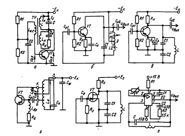 Основные типы LС- генераторов приведены на рис. 6.1. Они делятся на схемы с трансформаторной связью (рис. 6.1, и), индуктивной (рис. 6.1, б и г) и емкостной (рис. 6.1, в и д) трехточкой.