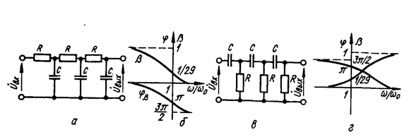 В качестве фазирующих используют цепочки, состоящие из простейших Г-образных RС- звеньев (обычно трех или четырех). Трехзвенная цепочка, так называемая С- параллель, показана на рис. 6.2, а, а R-параллель — на рис. 6.2, в. Частотные и фазовые характеристики цепочек С- и R-параллель приведены соответственно на рис. 6.2, б и 6.2, г.
