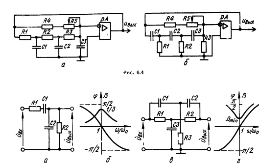 Как видно из рис. 6.2, б и 6.2, г, на квазирезонансной частоте фазовый сдвиг wb между входным и выходным напряжениями для цепочки R-параллель равен + 180°, а для цепочки С-параллель— —180°.