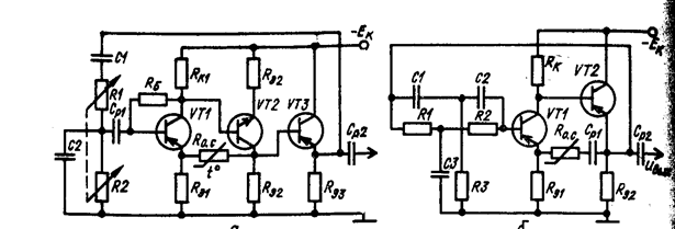 На рис. 6.6 приведены принципиальные схемы RС- автогенераторов на биполярных транзисторах, выполненных с мостом Вина (а) и двойным Т-образным мостом (б). Включение эмиттерного повторителя на транзисторе VТЗ исключает влияние входного сопротивления схемы с ОЭ на параметры фазирую-щей цепи, а следовательно на f0 и b0 .