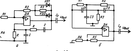 На рис. 6.4, а, б показаны схемы RС-автогенераторов на ОУ с фазирующими цепочками С-параллель и R-параллель. Поскольку частотно-избирательная RC-цепь включена между выходом и инвертирующим входом ОУ, общий Фазовый сдвиг в замкнутой петле равен 360, что обеспечивает выполнение условия баланса фаз. В связи с избыточностью коэффициента усиления ОУ условие баланса амплитуд обеспечивается без затруднения. Большое входное и малое выходное сопротивления ОУ позволяют осуществить режим практически идеального согласования фазирующей цепи