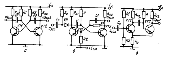 Есм через делитель RI, R2 на базу VТ1 последний в ждущем режиме заперт (устойчивое состояние). При запирании VТ2 по цепи ПОС открывается VТ1.