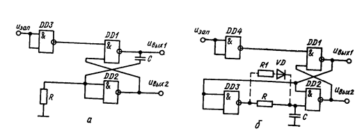 Для исключения «жесткого» запуска мультивибратора, при котором оба ЛЭ могут иметь низкий уровень напряжения на выходе, в схему включаются элементы DD3 и DD4 (см. рис. 6.9, б). При этом если uвых1 = uвых2 = U0вых, на выходе DD3 устанавливается 1, на выходе DD4—0, который, передаваясь на вход DD2, устанавливает на его выходе U1вых , исключая тем самым начальное нерабочее состояние.