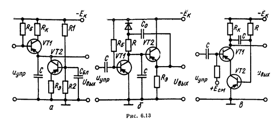 Схема ГПН с ООС представлена на рис. 6.13, в, где транзистор VТ2 — токостабилизирующии, а VТ1 — ключевой.