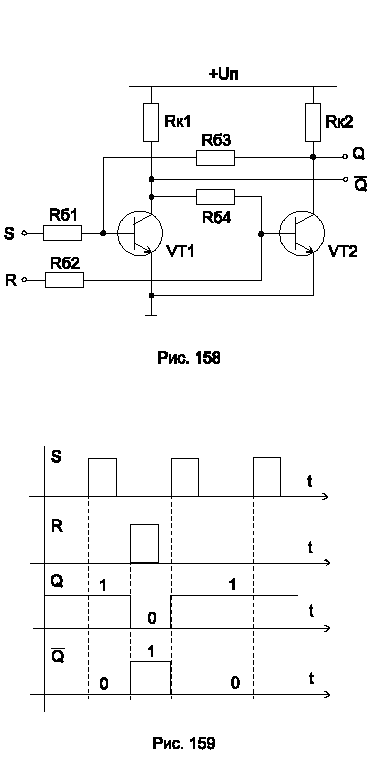 Диаграммы работы при наличии входных импульсных сигналов показаны на рис. 159. На интервале между импульсами на входах S и R триггер помнит то состояние, в которое он был установлен по этим входам, т.е. триггер - элемент памяти.