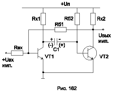 Одновибратор служит для формирования импульсов заданной длительности из импульсов любой ширины. Cхема одновибратора представлена на рис.162. Схему одновибратора можно представить в виде двух частей: одна часть - это половинка триггера, другая часть - это половинка мультивибратора.