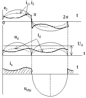 Токи и напряжения имеют одинаковую полярность, но в каждый момент времени изменяют свою величину (ток и напряжение в нагрузке имеют пульсирующий характер).