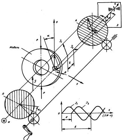 Рис. 16. Схема двулучепреломления плоскополяризованного луча в нагруженной модели при скрещенном положении поляроидов П и А