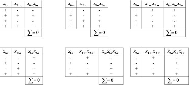 Матрица планирования эксперимента является ортогональной, если сумма произведений значений, приведенных в каждой строке двух любых столбцов матрицы, соответствующих рассматриваемым в эксперименте факторам или их взаимодействию, равна нулю.