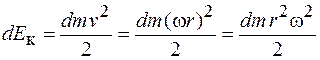 Рассчитаем теперь кинетическую энергию вращающегося тела. Выберем в теле элемент объема - материальную точку массой dm, движущуюся по окружности радиусом r с линейной скоростью v,и найдем ее кинетическую энергию на основании формулы (14.3):
