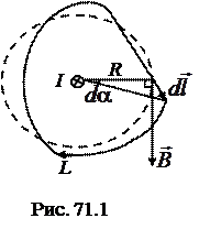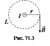 магнитного поля, созданного бесконечно длинным прямолинейным проводником с током (рис. 71.1). В качестве замкнутого контура L возьмем произвольный контур, лежащий в плоскости, перпендикулярной проводнику. Ток направлен за чертеж.