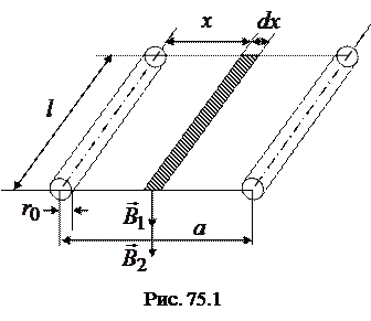 Для расчета индуктивности участка двухпроводной линии передачи сигналов (рис. 75.1) выделим между проводами элементарную площадку