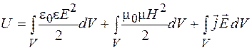 Можно показать, что первое слагаемое определяет энергию, которая идет на поляризацию вещества, второе – на его намагничивание, а третье позволяет рассчитать джоулеву теплоту, выделяющуюся в объеме V среды.