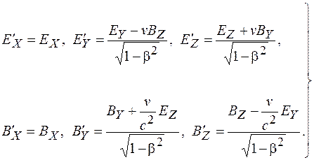 Все приведенные рассуждения справедливы для любых полей. Поэтому, объединяя вместе все соотношения для составляющих электрического и магнитного полей в разных системах отсчета, получаем: