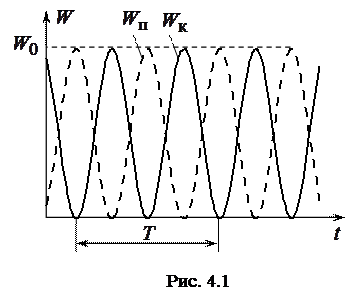Легко показать, что к подобному результату приводит рассмотрение энергетических превращений в процессе колебаний математического и физического маятников. Это позволяет сделать общий вывод: в процессе гармонических колебаний полная энергия системы остается постоянной; при этом происходит превращение энергии из одной формы в другую (кинетической в потенциальную, электрической в магнитную) так, что каждая из них изменяется с удвоенной частотой и в противофазе по отношению друг к другу.
