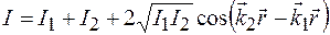 Полученное выражение показывает, что при наложении в точке наблюдения двух когерентных волн интенсивность в общем случае не равна сумме интенсивностей складываемых волн, а зависит от оптической разности хода этих волн до точки наблюдения. Явление наложения двух (или большего числа) когерентных волн, в результате которого происходит перераспределение интенсивности излучения в пространстве, называется интерференцией. Максимальная интенсивность будет, когда