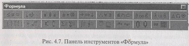 Для набора формул используется панель инструментов «Формула» (рис 4.7).