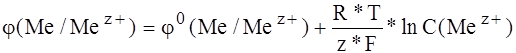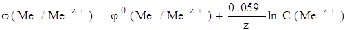 Если считать T=298К и учесть значение R и F, а также перейти от натурального логарифма к десятичному, то уравнение Нернста позволит рассчитать электродный потенциал при данной концентрации электрода в стандартных условиях примет следующий вид.