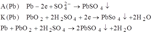 Свинцово-кислотный аккумулятор состоит из решётчатых свинцовых пластин, поры в решётках заполнены. В одной – губчатый свинец (Pb), в другой решётке паста из оксида свинца (PbO2). Пластины погружены в электролит H3SO4 (ρ=1,23г/см3,ω(H3SO4)=35,4%)