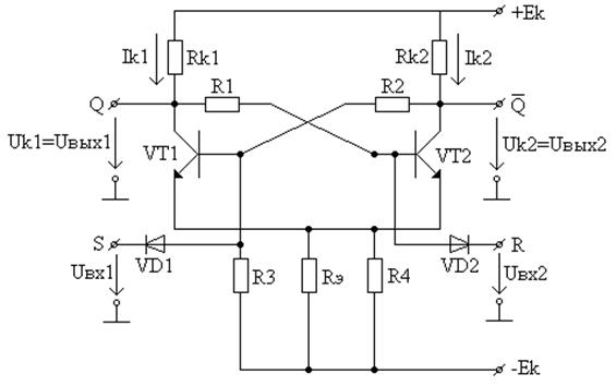 Процесс идет скачком, пока VT1 полностью открыт, а VT2 полностью закрыт. Это первое условие равновесия триггера. Его внутренняя схема представляет собой 2ух-каскадный УПТ с перекрестными 100%-ными положительными обратными связями R1 и R2. Описанное состояние триггер способен сохранять сколь угодно долгое время, пока на его входы не поступит управляющий сигнал (отрицательный внешний импульс). При поступлении отрицательного импульса на вход SET-установка VT1 скачком закроется, а VT2 откроется, в результате,