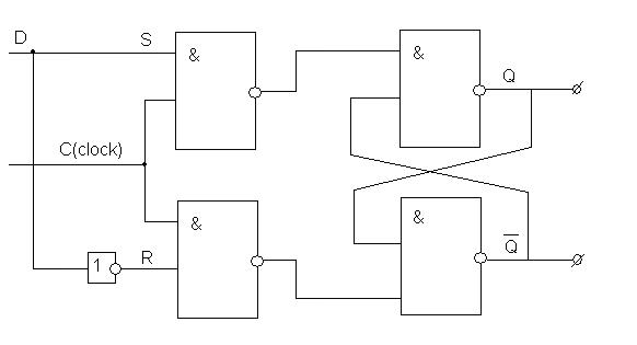 В D-триггере имеется один информационный вход и 1 вход синхронизации (разрешения, стробирования). Одновременная подача на вход S и R противоположных по знаку сигнала, за счет внутреннего инвертирования сигнала D, с помощбю элемента НЕ.