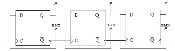 Счетчики выполняются на триггерах, количество которых является разрядностью передаваемой информации. Триггеры соединены последовательно (прямо или инверсно) со счетным входным последующим переносом.
