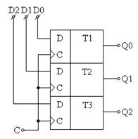 Параллельный трехразрядный регистр на динамических D-триггерах.
