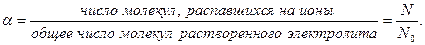 Степень диссоциации. Сильные и слабые электролиты. Количественной характеристикой электролитической диссоциации является степень диссоциации электролита в растворе. Эта характеристика была введена Аррениусом. Степень диссоциации – a - это отношение числа молекул N, распавшихся на ионы, к общему числу молекул растворенного электролита N0: