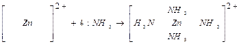 При взаимодействии иона цинка с молекулами аммиака, атомы азота которого имеют неподеленные пары электронов (:NН3), образуется комплекс: