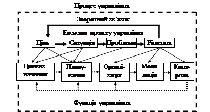 Як відомо, процесний підхід передбачає виокремлення та опис окремих функцій менеджера. Управління розглядається як процес, тому що робота щодо досягнення цілей за допомогою інших – це не яка-небудь одночасна дія, а серія безперервних дій, які називаються управлінськими функціями. Звідси процес управління являє собою суму усіх функцій, тобто видів цілеспрямованої діяльності щодо об’єкта управління. Вони зумовлені кооперацією і поділом праці всередині управлінського персоналу, і ним властиве замкнене коло робіт (підфункцій), що поєднані спільністю значення і відіграють певну роль в управлінській діяльності.