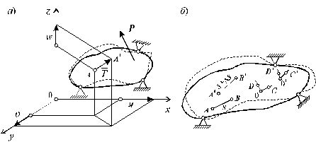 деформированного состояния, называется вектором полного перемещения т. А (рис. 1.8, а). Его проекции на оси xyz называются осевыми перемещениями и обозначаются u, vи w, соответственно.