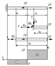Стержень может быть разделен на два участка, граничными точками которых являются точки приложения сосредоточенных сил и точка закрепления. Если начало координат расположить на правом конце стержня, а ось z направить справа налево, то, используя метод сечений, рассекая последовательно участки, отбрасывая левую часть,заменяя ее действие внутренними усилиями N, Qy, Mx и уравновешивая оставшуюся часть, получим: