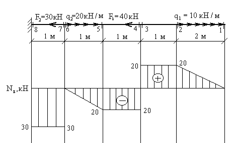 1. Намечаем характерные сечения, нумеруя их от свободного конца стержня к заделке.