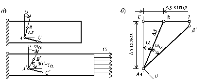 Рассмотрим прямой угол АВС (рис. 2.12, а), образованный отрезками АВ и АС, в недеформированном состоянии.