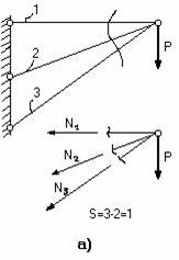 Если конструкцию кронштейна усложнить, добавив еще один стержень (рис.2.38, б), то усилия в стержнях N1, N2 и N3 прежним способом определить уже не удастся, т.к. при тех же двух уравнениях равновесия (2.37) имеются уже три неизвестных усилия в стержнях. В таких случаях говорят, что система один раз статически неопределима.