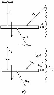 На рис.2.38, а изображен кронштейн, состоящий из двух стержней, шарнирно скрепленных между собой. В связи с тем, что на конструкцию действует лишь вертикальное усилие Р, а система является плоской (т.е. все элементы конструкции и вектор внешних сил лежат в одной плоскости), получается, что усилия в стержнях легко определяются из условий равновесия узла