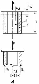 Для системы из трех стержней (рис.2.39, б) можно составить два уравнения равновесия, а неизвестных сил в системе три, следовательно, система один раз статически неопределима. Один из стержней не нужен для равновесия системы, и его можно отбросить. Рассуждая аналогично, можно установить, что система из четырех стержней (рис.2.39, в) дважды статически неопределима.