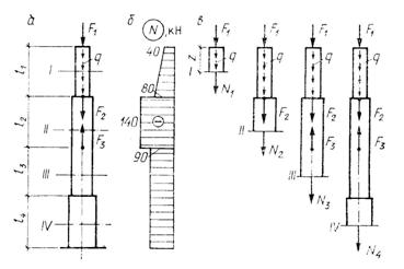 (рис. б), соблюдая масштаб. Из анализа эпюры следует, что на участках, свободных от нагрузок, продольная сила постоянна, на нагруженных – переменна, в точках приложения сосредоточенных сил – изменяется скачкообразно.