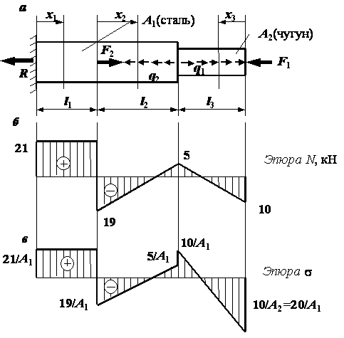Зная продольную силу, находим напряжения в стержне и строим эпюру распределения напряжений по длине стержня (рис. в). Заметим, что на эпюре продольных сил скачки (т.е. резкие изменения усилий при переходе в соседнее сечение) имеют место под сосредоточенными силами на величину этих сил, на эпюре напряжений скачки появляются так же и в местах изменения поперечного сечения.