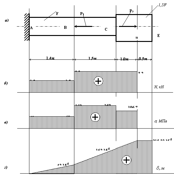 1. построить эпюры продольных сил N, нормальных напряжений σ и перемещений сечений