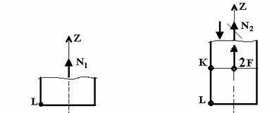 Участок KL: рассекаем брус поперечным сечением и отбрасываем ту его часть, на которой расположена заделка. Заменяем ее действие неизвестной, продольной силой N1, предположительно направив ее на растяжение, т.е. от сечения (рисунок 2). Составляем уравнение статического равновесия, выбрав положительное направление осиZ, и определяем величину продольной силы N1: