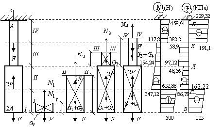 Построить эпюры нормальных сил и нормальных напряжений для бруса, изображенного на рис. а. Принять a = 0,4 м; площадь поперечного сечения бруса на участкахIII и IV А = 20 см2; сосредоточенная сила F = 0,5 кН, собственный вес