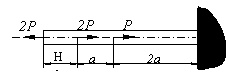 Найти продольные силы N на участках стержня, построить эпюру, вычислить напряжения во всех участках представленного на рисунке стального стержня и полную его деформацию. Сила Р = 20 кН, а = 1 м, площадь поперечного сечения стержня F=5 см2.