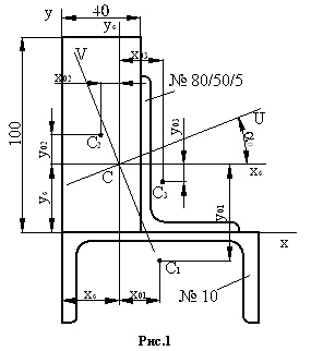 Пример 3. Для фигуры, показанной на рис.1 определить положение главных осей инерции и главные моменты инерции.