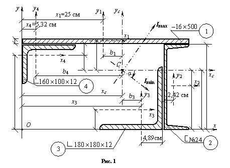 1) Сначала вычерчивается поперечное сечение. Случайные оси х, у ставим так, чтобы все точки поперечного сечения находились в 1-м квадранте (рис.1). Каждому прокатному профилю присваивается порядковый номер. Наносим местные оси координат хi, уi, проходящие через известные центры тяжести i–го профиля. Оси хi, уiпараллельны случайным осям х, у соответственно.