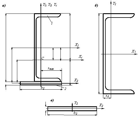 Сложное сечение состоит из двух составляющих: 1 – швеллер № 20, 2 – прямоугольник с размерами h2 = 1 см, b2 = 12 см. Ось Y проходит через центр тяжести обоих составляющих (рис. а).