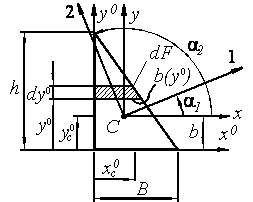 Оси x, y являются главными центральными для прямоугольного поперечного сечения, так как они совпадают с осями геометрической симметрии. Оси x0, y0 − в данном случае будут вспомогательными. Для определения осевого момента инерции Jx выделим на расстоянии y полоску шириной B и толщиной dy, следовательно dF=Bdy, тогда