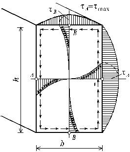 На рис. 4.3 показана, полученная методом теории упругости, эпюра касательных напряжений для бруса прямоугольного сечения. В углах, как видно, напряжения равны нулю, а наибольшие их значения возникают по серединам больших сторон:
