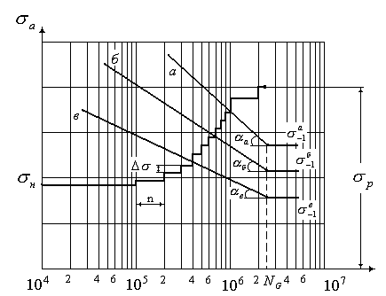 МПа/цикл. Длительность испытания на каждом из уровней напряжений выбирают в диапазонеn=5·104...105 циклов. При этом число ступеней нагружения должно быть не менее 8-10. В противном случае следует снизить длительность испытаний n. Приращение амплитуды напряжения